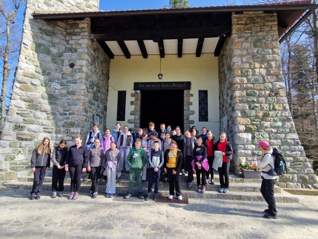 Planinarenje smo nastavili prema kapelici Majke Božje Sljemenske. Ondje smo se kratko zaustavili i razgledali kapelicu, a posebno zanimljiv dio bilo je kratko predavanje koje nam je održala volonterska predavačica Ivana. Učenici su imali priliku saznati kako je kapelica nastala, od kojih je materijala izgrađena te čuti zanimljivosti o njezinoj unutrašnjosti i povijesti.