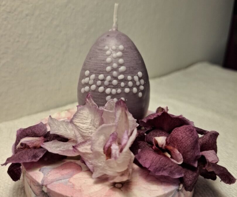 Za izložbu smo pripremili ljubičastu pisanicu sa motivom križa. Pisanica – svijeća izrađena je lijevanjem recikliranog voska u silikonski kalup. Motiv križa napravljen je otiskivanjem vrućeg tekućeg voska pomoću drvenog štapića. Postolje pisanice je držač za svijeću. Izrađeno je lijevanjem gipsa u silikonski kalup, obojeno je bijelom akrilnom bojom, a zatim je korištena salvetna tehnika. Postolje pisanice ukrašeno je osušenim cvjetovima orhideja.